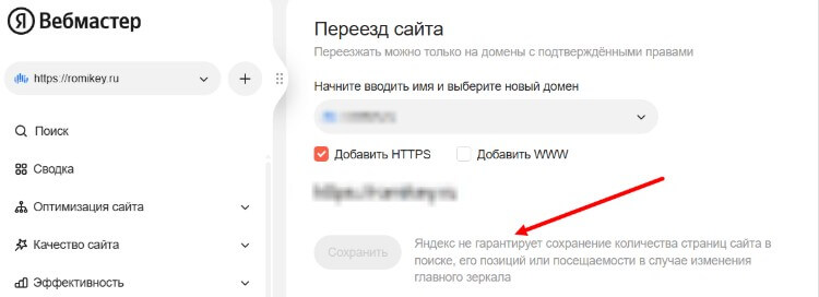 — Удаление старого сайта из Вебмастера до завершения переезда